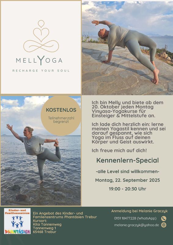 Ich bin Melly und biete ab dem 20. Oktober jeden Montag Vinyasa-Yogakurse für Einsteiger & Mittelstufe an.