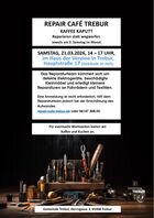 | Samstag, 21. März 2026 14:00 Uhr | KaffeeKaputt/Repair-Cafe TreburEine Vorabinformation um was für ein Gegenstand/Gerät es sich handelt und welcher Defekt vorliegt bitte über das Anmeldeformular Repair Café einreichen. Ebenso mitteilen zu welchem Termin Sie kommen möchten.