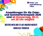 Anmeldungen für die Oster- und Sommerferienspiele 2025sind ab Donnerstag, 28. November, 20 Uhr möglich. >> zur Anmeldung Weiter Infos gibt es auf unserer Website unter http://www.kiju-treb…