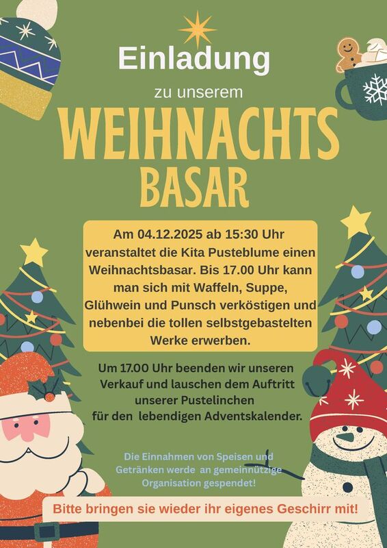 Am 04.12.2025 ab 15.30 Uhr veranstaltet die Kita Pusteblume einen Weihnachtsbasar. Bis 17.00 Uhr kann man sich mit Waffeln, Suppe, Glühwein und Punsch verköstigen und nebenbei die tollen selbstgebastelten Werke erwerben.