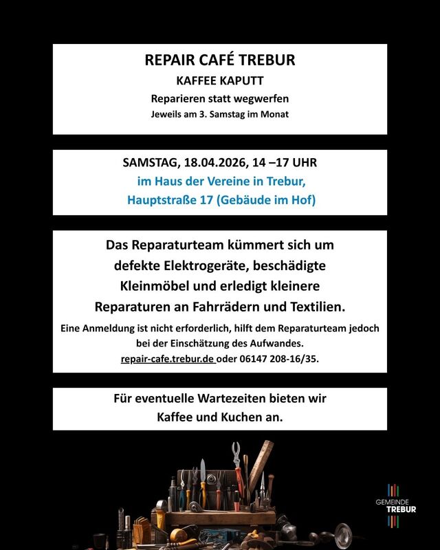 REPAIR-CAFE(at)TREBUR.DE oder 06147 208-35.