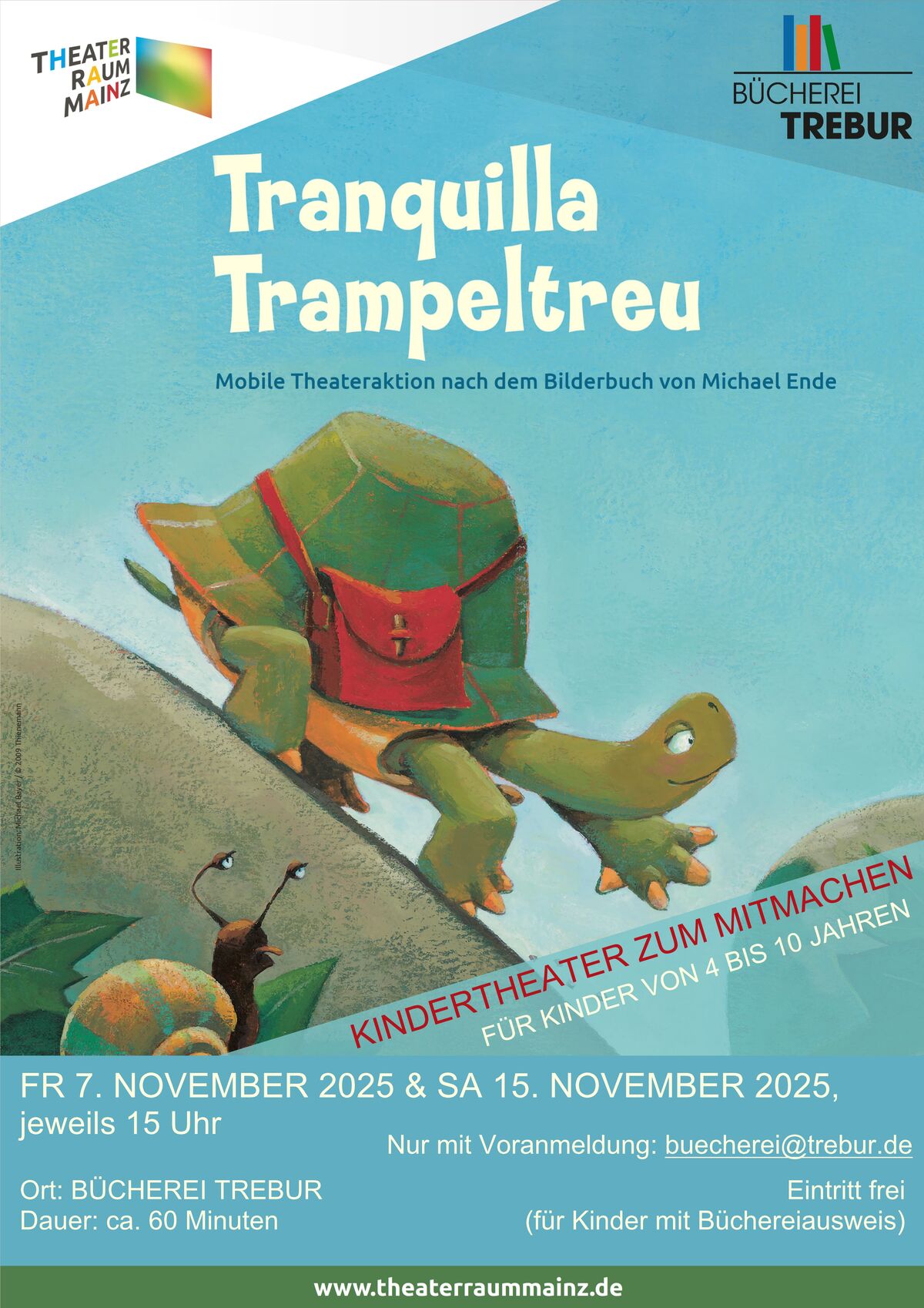 Kindertheater Tranquilla TrampeltreuKindertheater ZUM MITMACHEN für Kinder von 4 bis 10 Jahren. Dauer ca. 60 Minuten Nur mit Voranmeldung: buecherei@trebur.de Eintritt frei (für Kinder mit Büchereiausweis)