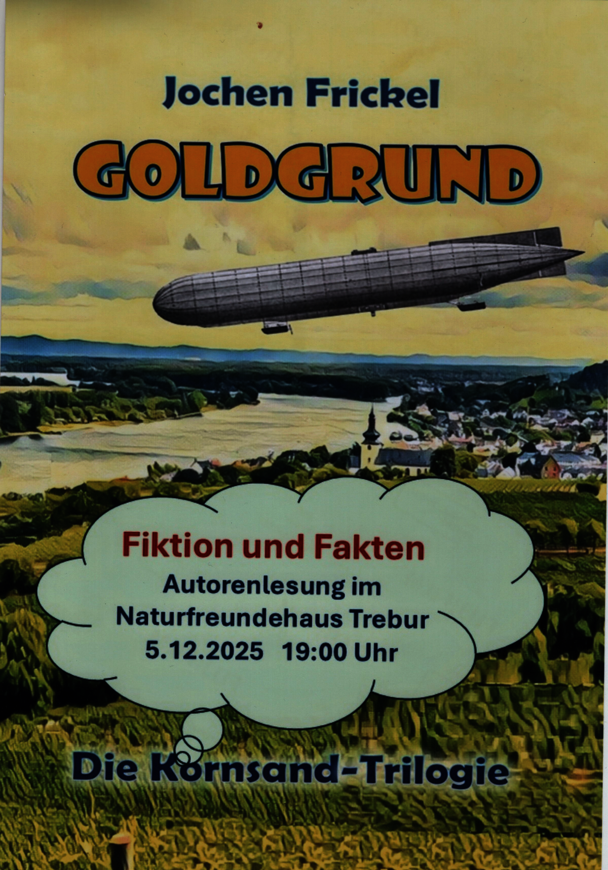 Lesung: Jochen Frickel liest aus GoldgrundLesung mit Jochen Frickel Am Freitag, 5. Dezember, um 19 Uhr im Naturfreundehaus Trebur, Trebur. Der Eintritt ist kostenlos – freiwillige Spenden sind herzlich willkommen. Jochen Frickel, Jahrgang 1946, lebt in Bischofsheim bei Mainz und bezeichnet sich augenzwinkernd selbst als „Deutschlands ältesten Nachwuchsautor“. In „Goldgrund“ verbindet Frickel mehrere Erzählstränge: Zwei Familien, getrennt durch einen breiten Strom – und doch durch eine jahrhundertealte gemeinsame Geschichte verbunden. Getrennt schließlich durch die Vernichtungspläne eines menschenverachtenden Regimes. Zwei Angehörige dieser Familien, unschuldig Opfer brutaler Verbrechen. Ihre Schicksale verschmelzen mit historischen Ereignissen am Kornsand bei Trebur.
